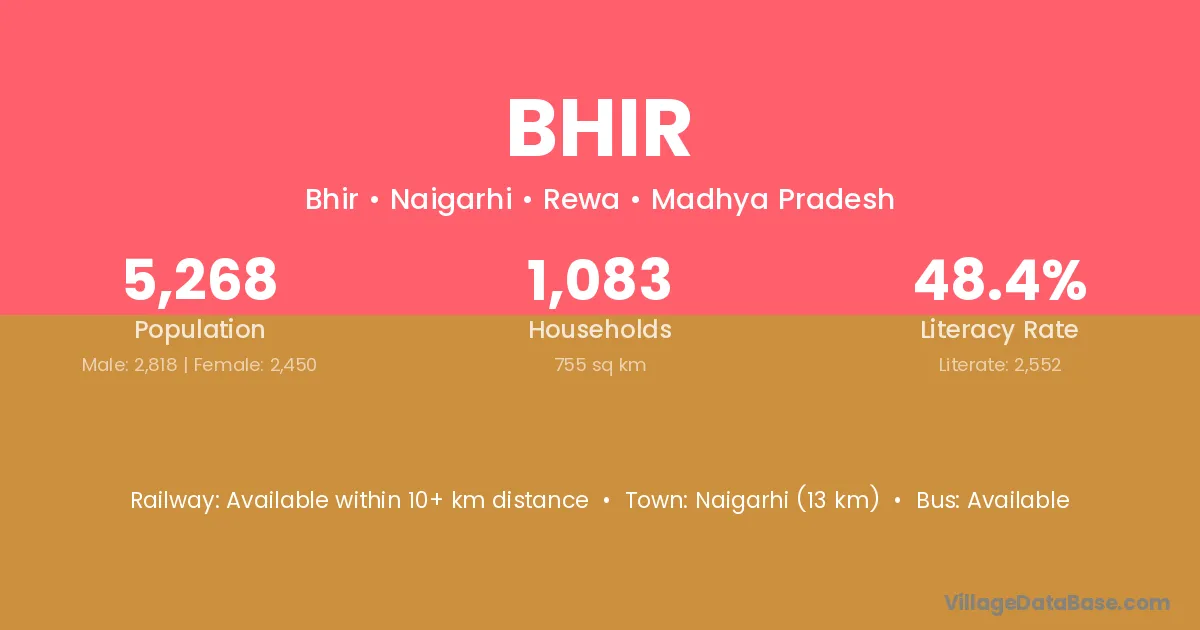 Bhir village has a total population of 5,268 people, of which 2,818 are males and 2,450 are females.