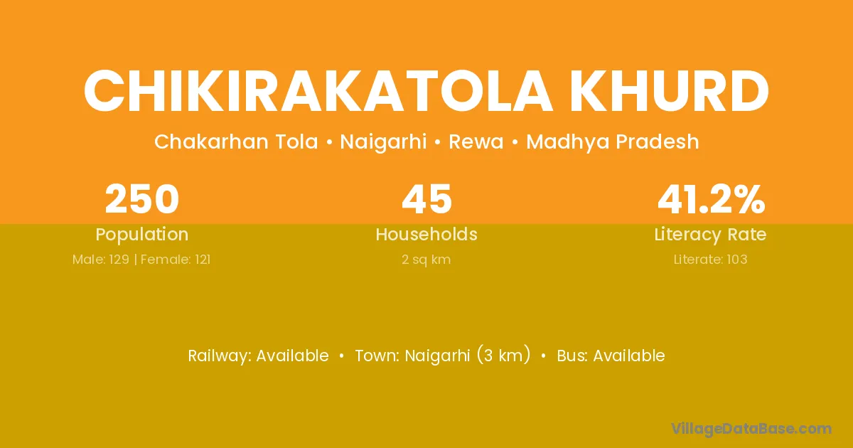 Chikirakatola Khurd village has a total population of 250 people, of which 129 are males and 121 are females.