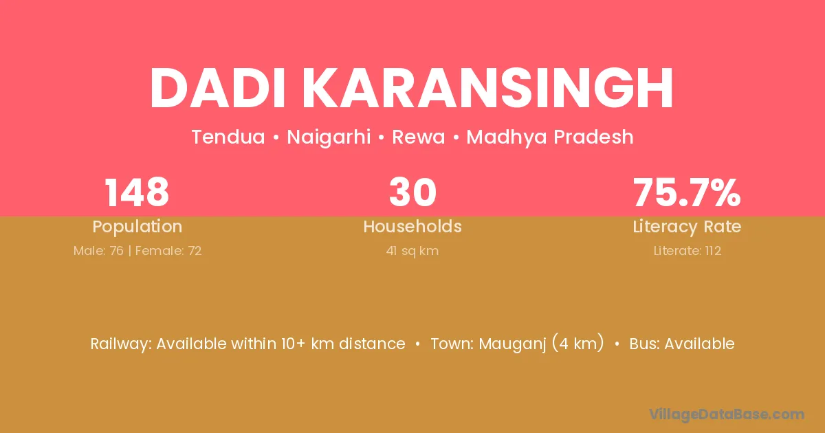 Mauganj (4 km) is the nearest town to Dadi Karansingh village for major economic activities and is located approximately 4 km away.