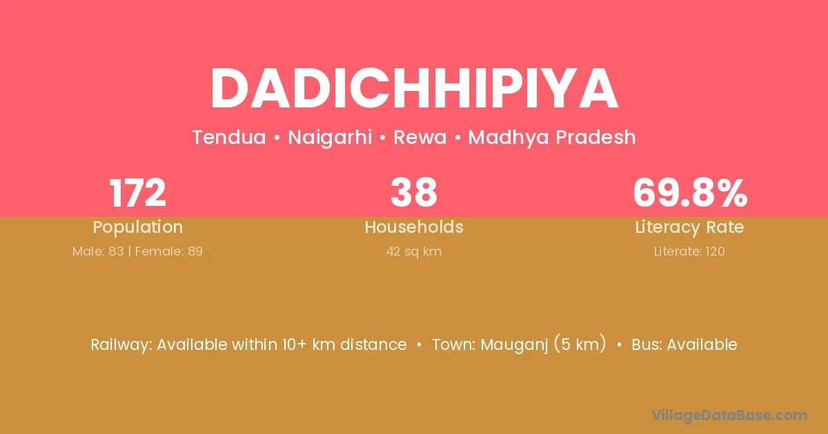 Dadichhipiya village has a total population of 172 people, of which 83 are males and 89 are females.