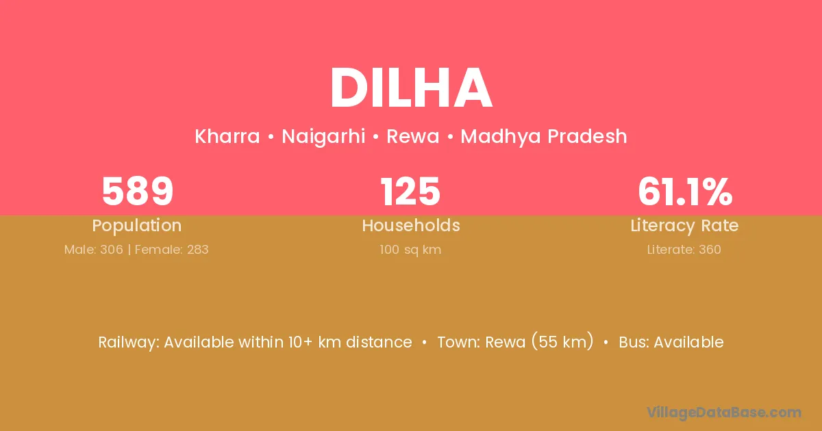 Rewa (55 km) is the nearest town to Dilha village for major economic activities and is located approximately 55 km away.