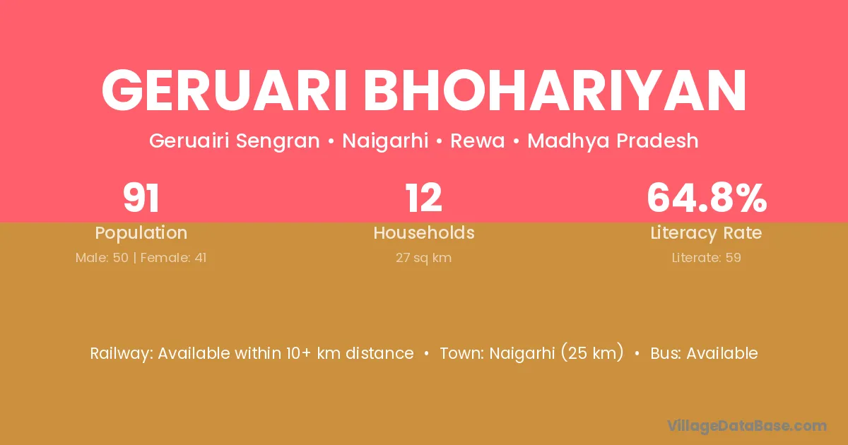 Geruari Bhohariyan village has a total population of 91 people, of which 50 are males and 41 are females.
