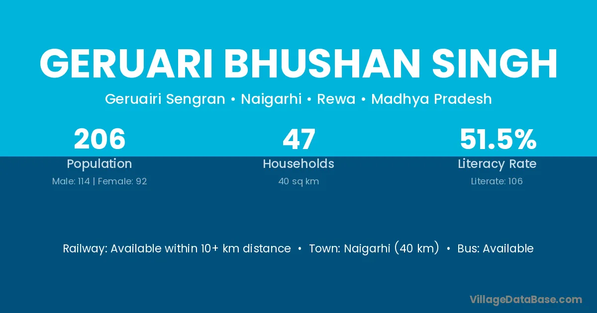 Geruari Bhushan Singh village has a total population of 206 people, of which 114 are males and 92 are females.