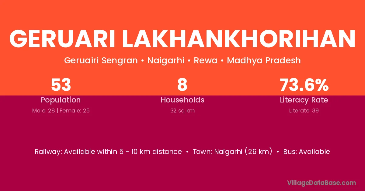 Geruari Lakhankhorihan village has a total population of 53 people, of which 28 are males and 25 are females.