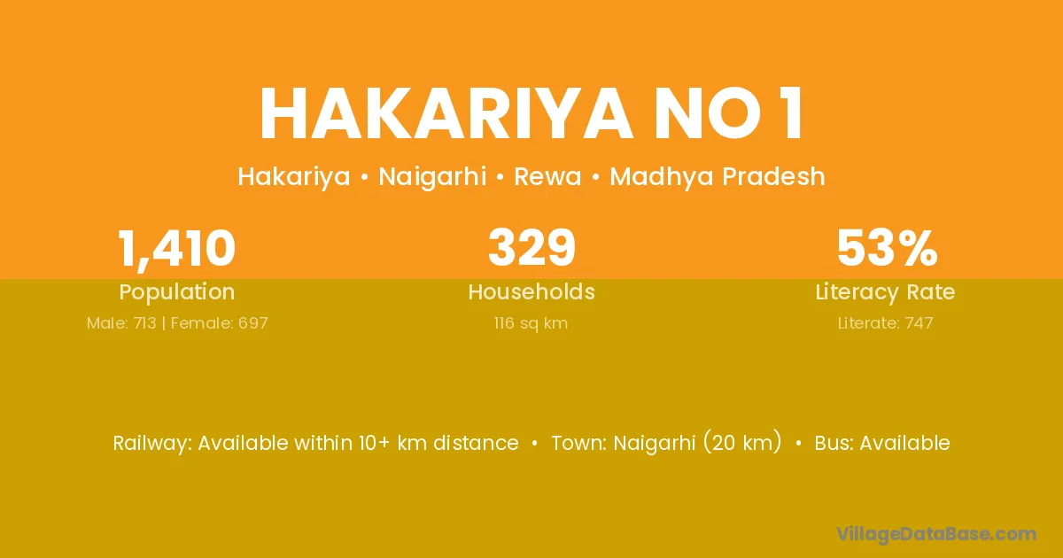 Hakariya No 1 village has a total population of 1,410 people, of which 713 are males and 697 are females.