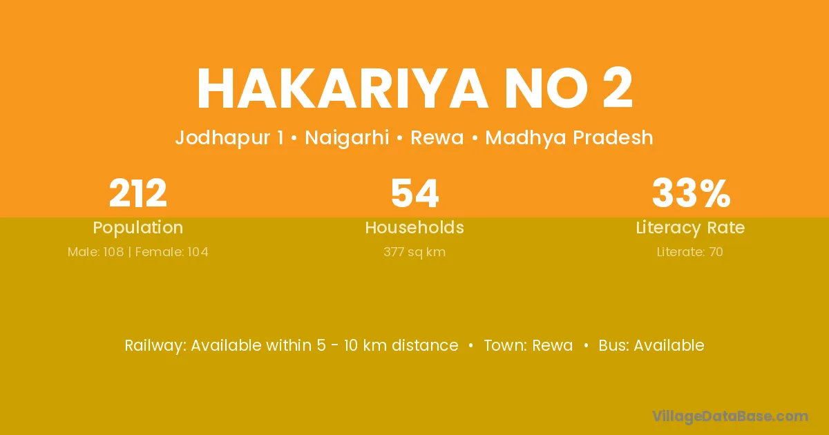 Hakariya No 2 village has a total population of 212 people, of which 108 are males and 104 are females.
