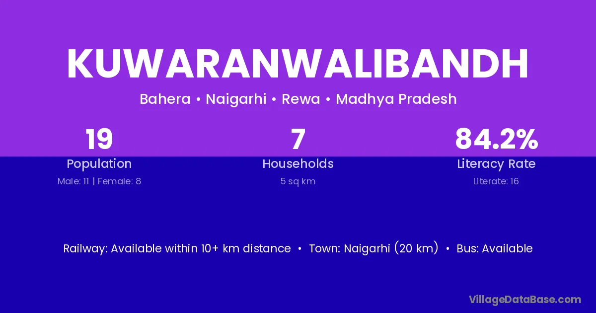 Kuwaranwalibandh village has a total population of 19 people, of which 11 are males and 8 are females.
