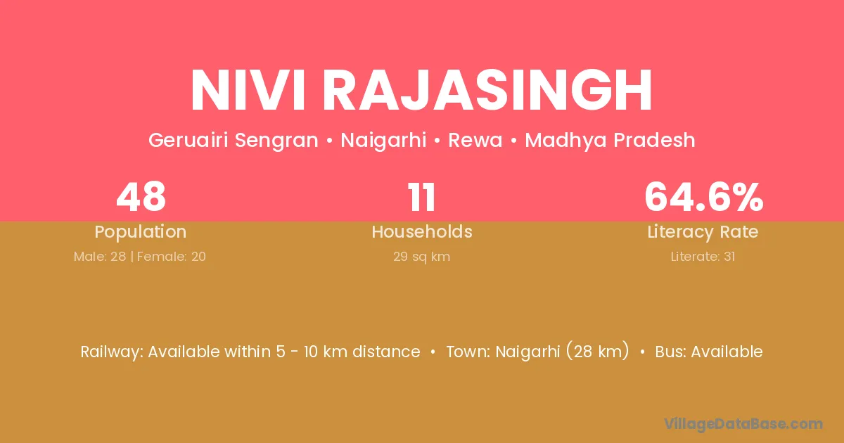 Nivi Rajasingh village has a total population of 48 people, of which 28 are males and 20 are females.