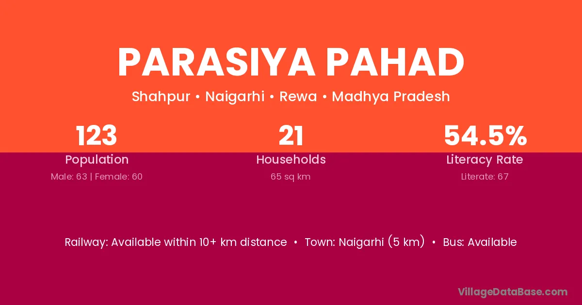 Parasiya Pahad village has a total population of 123 people, of which 63 are males and 60 are females.