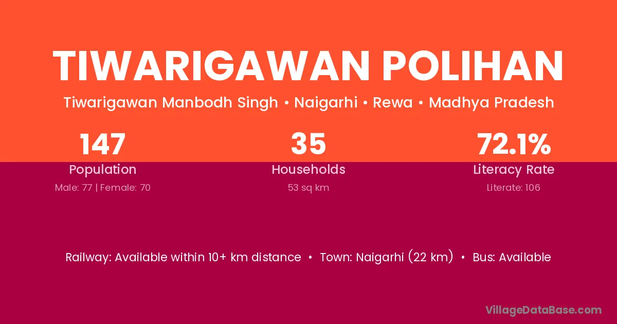 Tiwarigawan Polihan village has a total population of 147 people, of which 77 are males and 70 are females.