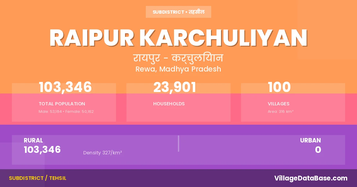 Raipur Karchuliyan is a town and Tehsil in the Rewa district of the Madhya Pradesh. In India, a Tehsil is a subdivision of a district responsible for the administration and revenue collection of a specific area within the district. Tehsils play a crucial role in the local governance structure, contributing significantly to the development and administration of their communities.