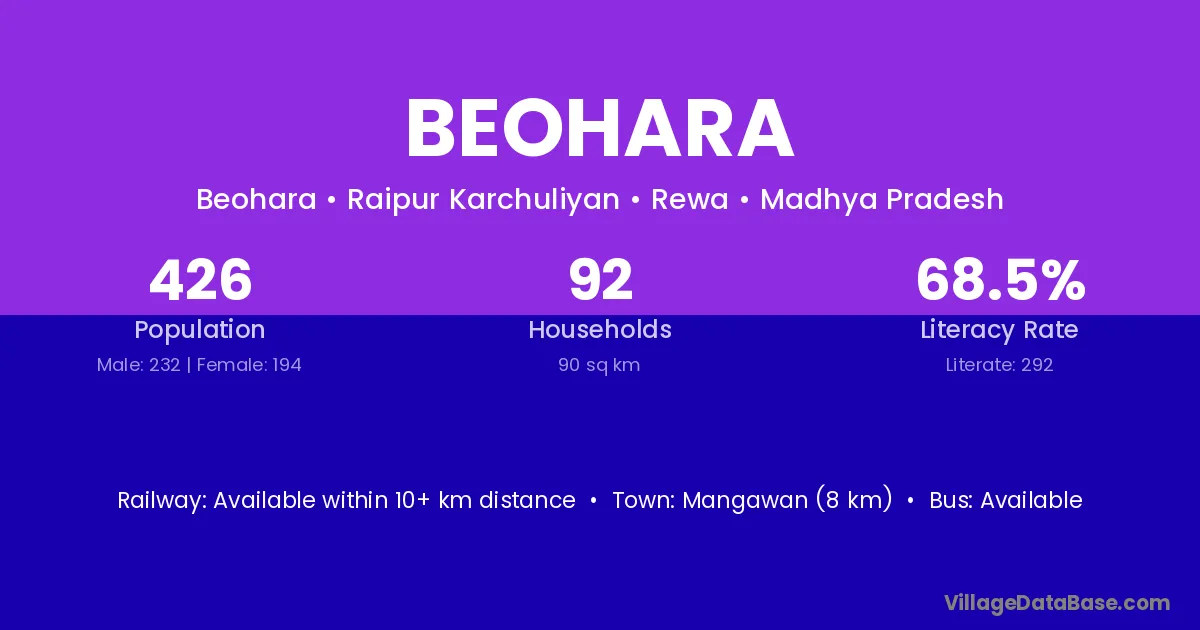 Mangawan (8 km) is the nearest town to Beohara village for major economic activities and is located approximately 8 km away.