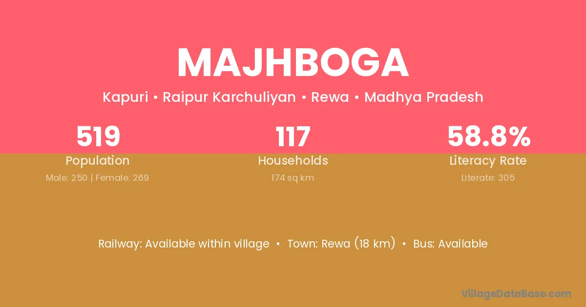 Rewa (18 km) is the nearest town to Majhboga village for major economic activities and is located approximately 18 km away.