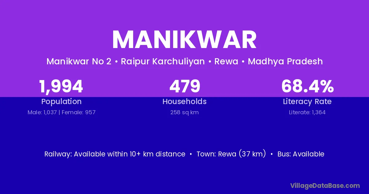 Rewa (37 km) is the nearest town to Manikwar village for major economic activities and is located approximately 37 km away.