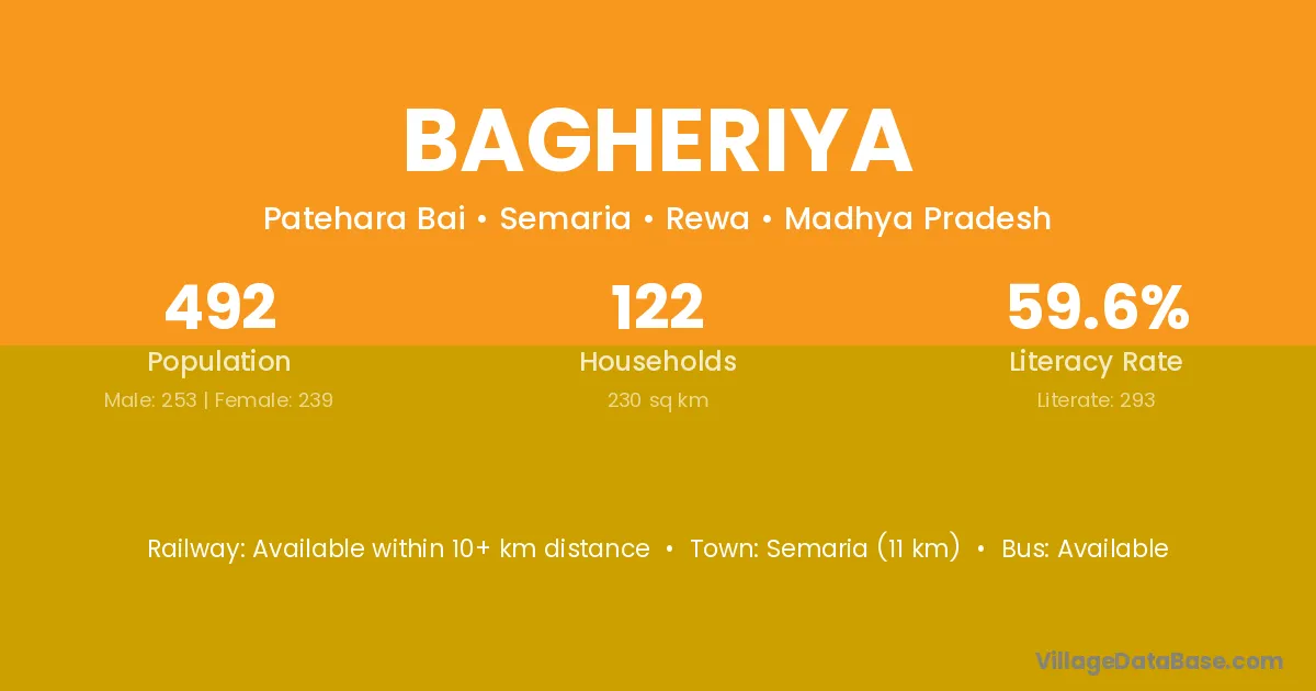 Bagheriya village has a total population of 492 people, of which 253 are males and 239 are females.