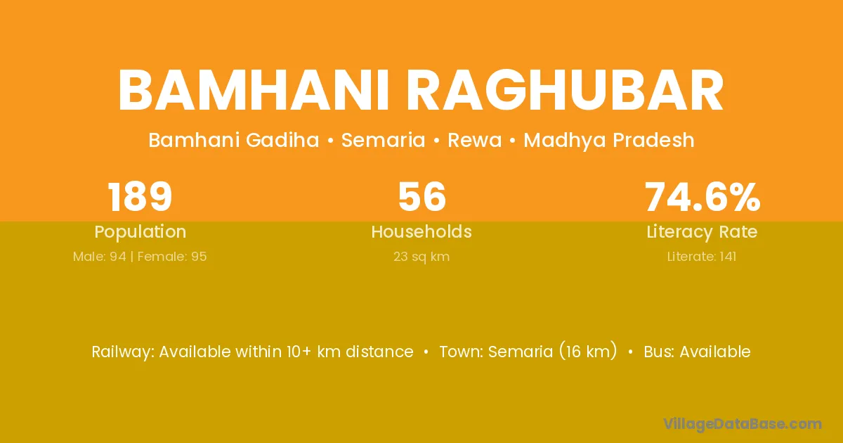 Bamhani Raghubar village has a total population of 189 people, of which 94 are males and 95 are females.
