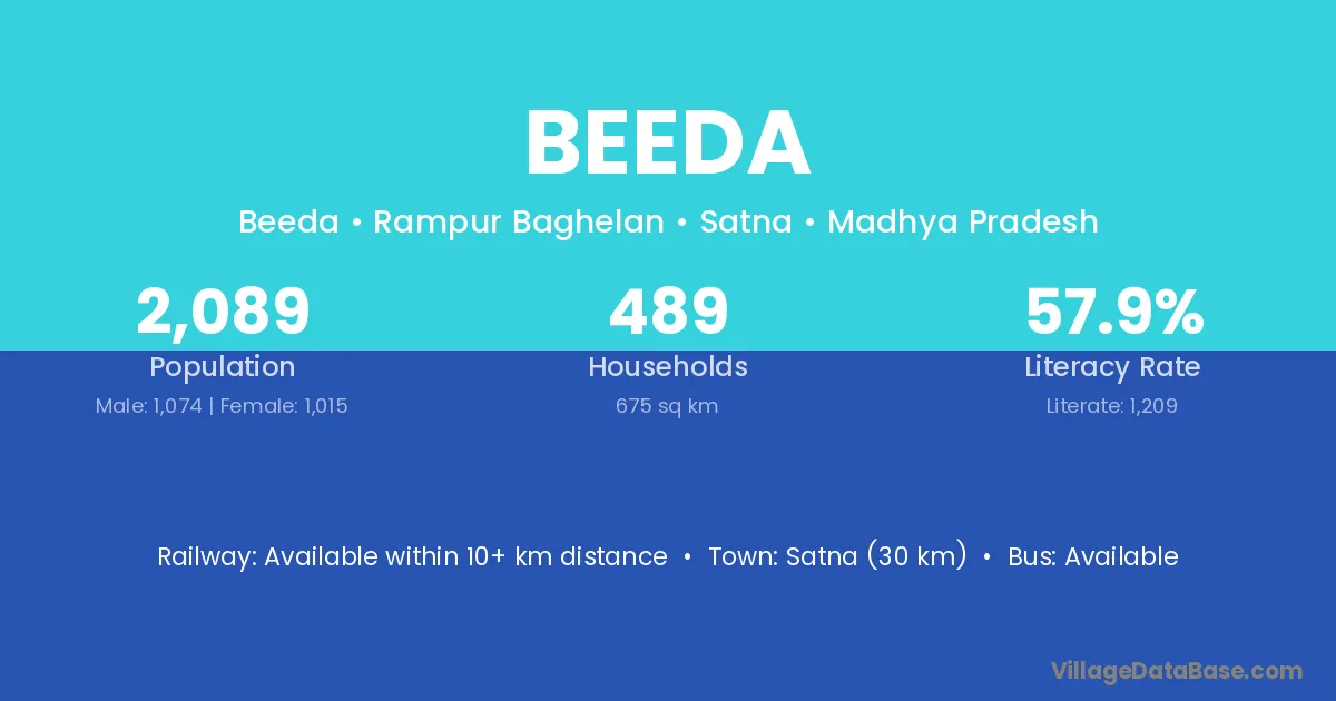 Semaria (30 km) is the nearest town to Beeda village for major economic activities and is located approximately 30 km away.