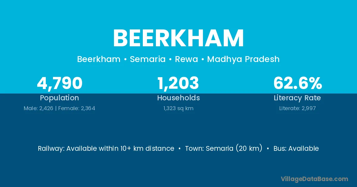 Semaria (20 km) is the nearest town to Beerkham village for major economic activities and is located approximately 20 km away.