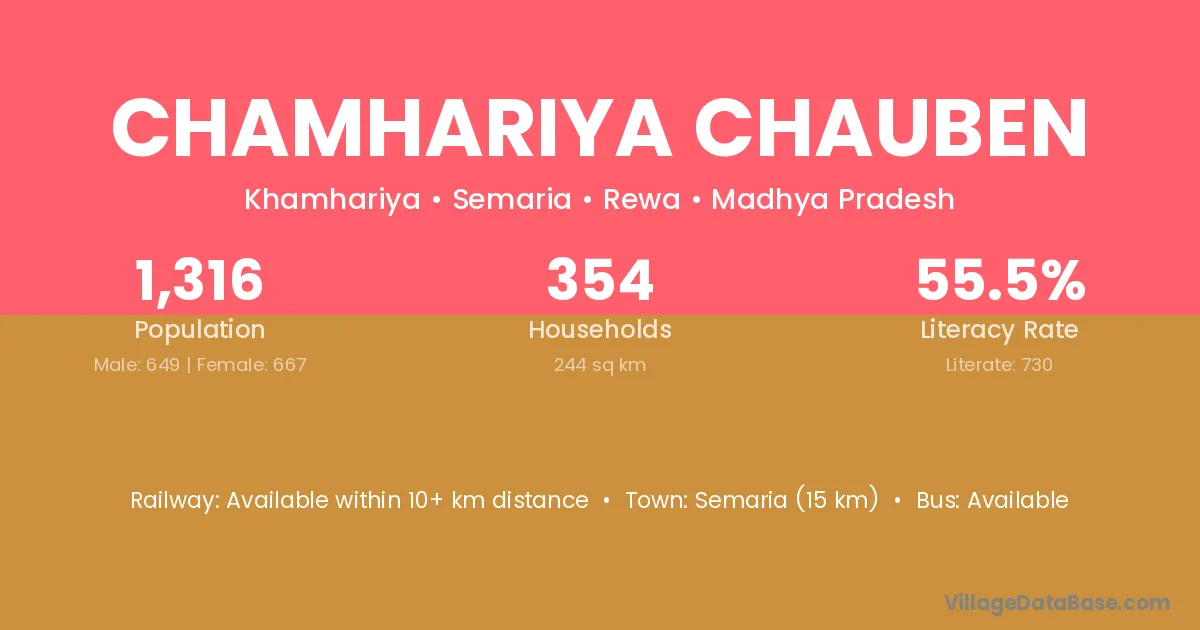 Chamhariya Chauben village has a total population of 1,316 people, of which 649 are males and 667 are females.