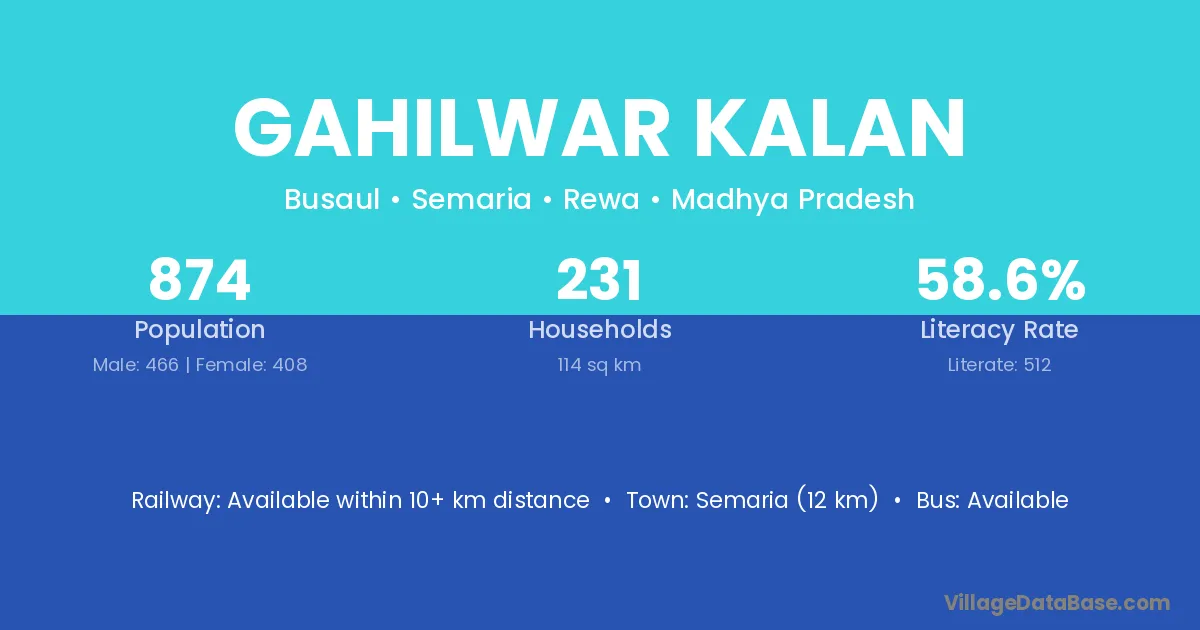 Gahilwar Kalan village has a total population of 874 people, of which 466 are males and 408 are females.