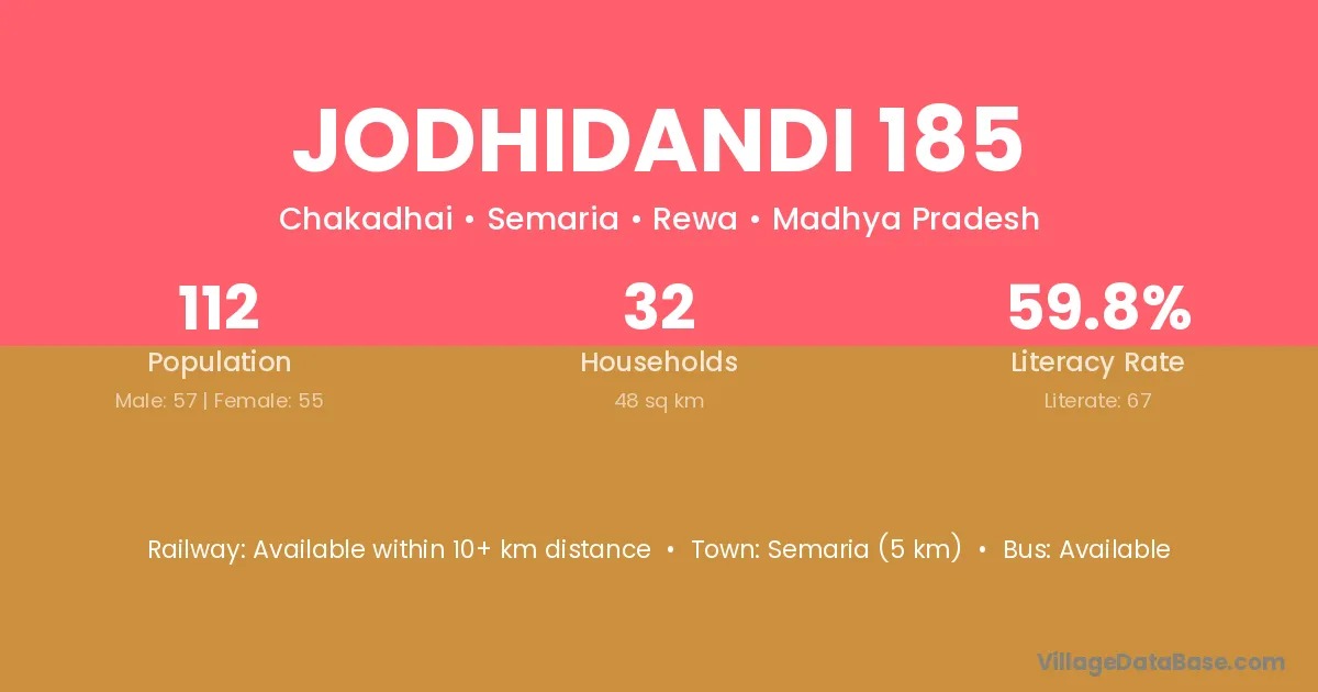 Jodhidandi 185 village has a total population of 112 people, of which 57 are males and 55 are females.