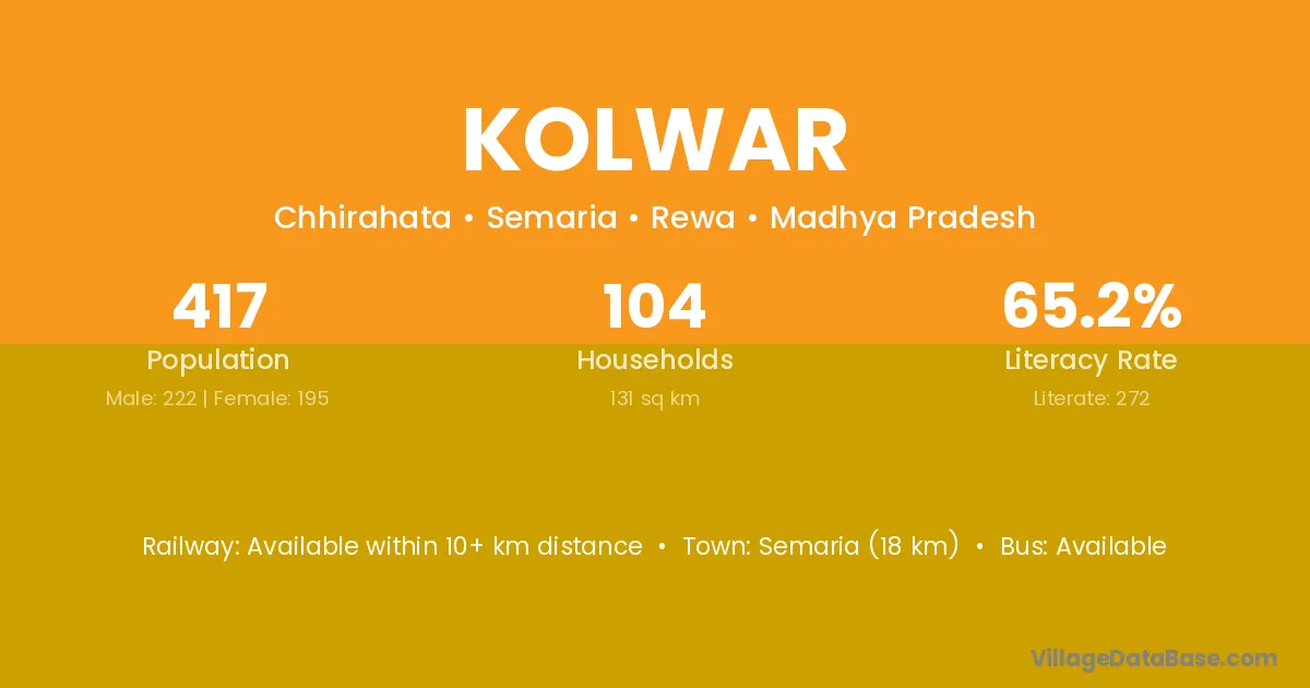 Semaria (18 km) is the nearest town to Kolwar village for major economic activities and is located approximately 18 km away.