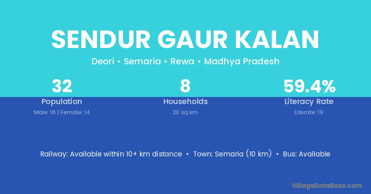 Sendur Gaur Kalan village has a total population of 32 people, of which 18 are males and 14 are females.