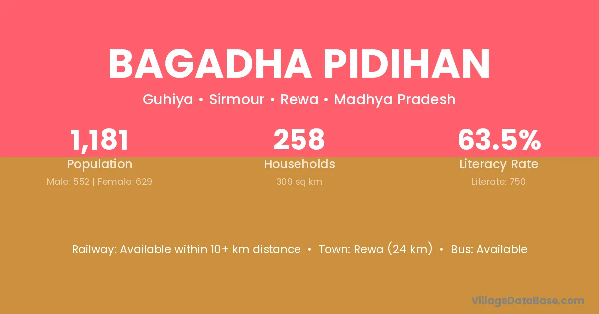 Rewa (24 km) is the nearest town to Bagadha Pidihan village for major economic activities and is located approximately 24 km away.