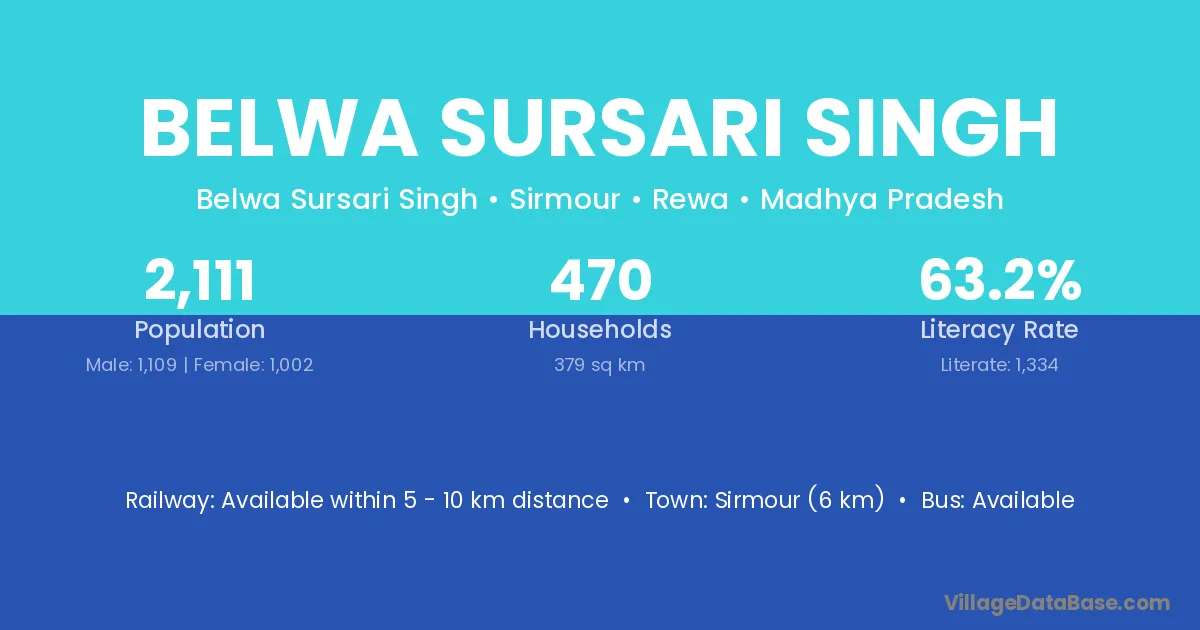 Belwa Sursari Singh village has a total population of 2,111 people, of which 1,109 are males and 1,002 are females.