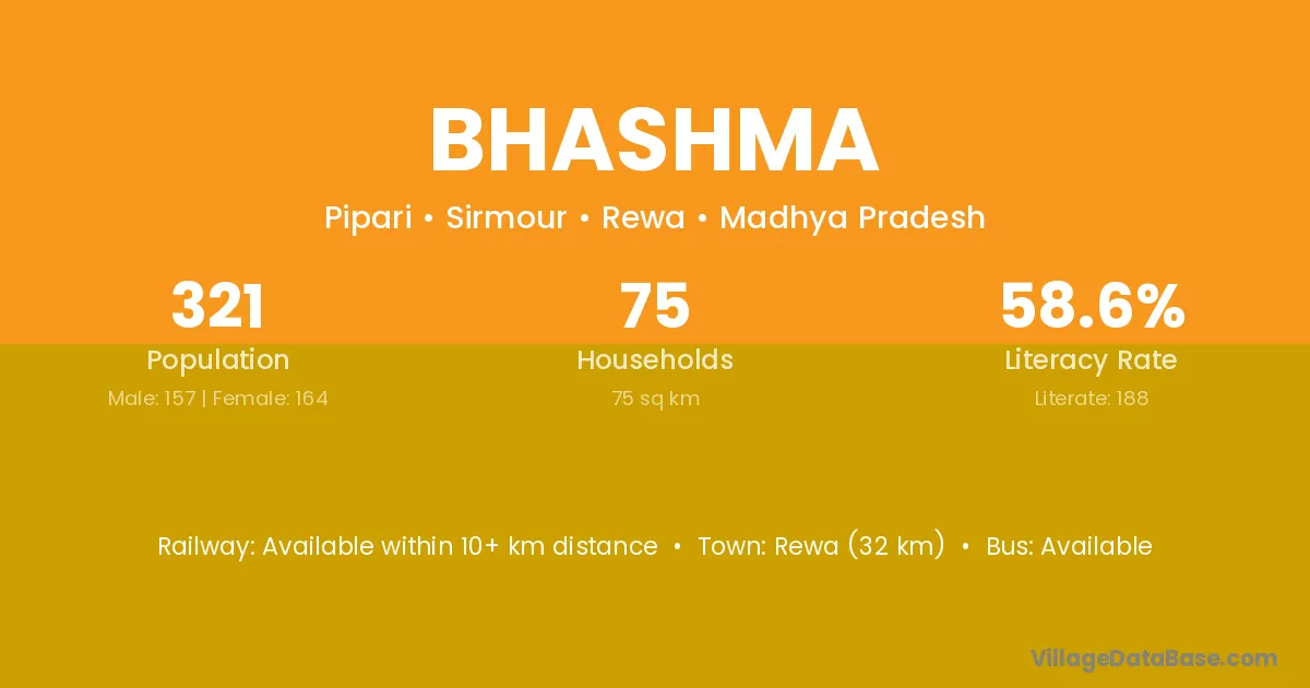 Rewa (32 km) is the nearest town to Bhashma village for major economic activities and is located approximately 32 km away.