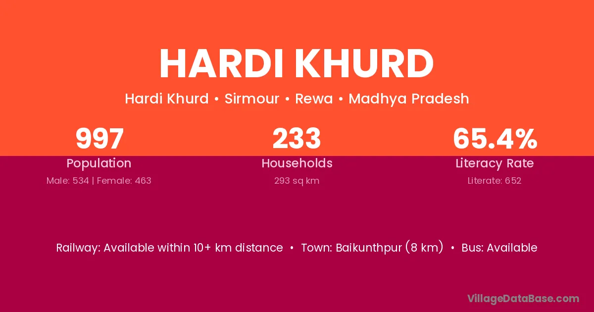 Hardi Khurd village has a total population of 997 people, of which 534 are males and 463 are females.