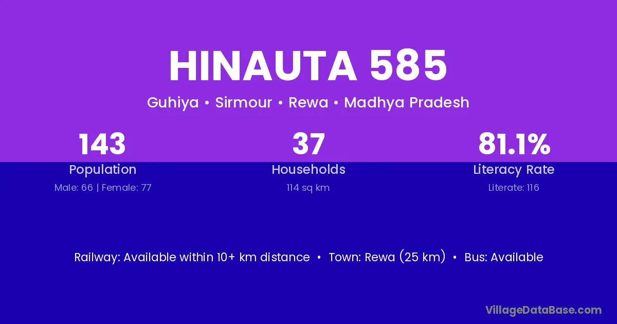 Rewa (25 km) is the nearest town to Hinauta 585 village for major economic activities and is located approximately 25 km away.