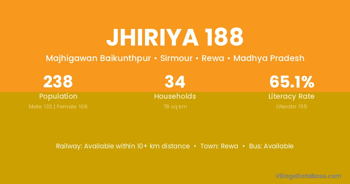 Jhiriya 188 village has a total population of 238 people, of which 132 are males and 106 are females.