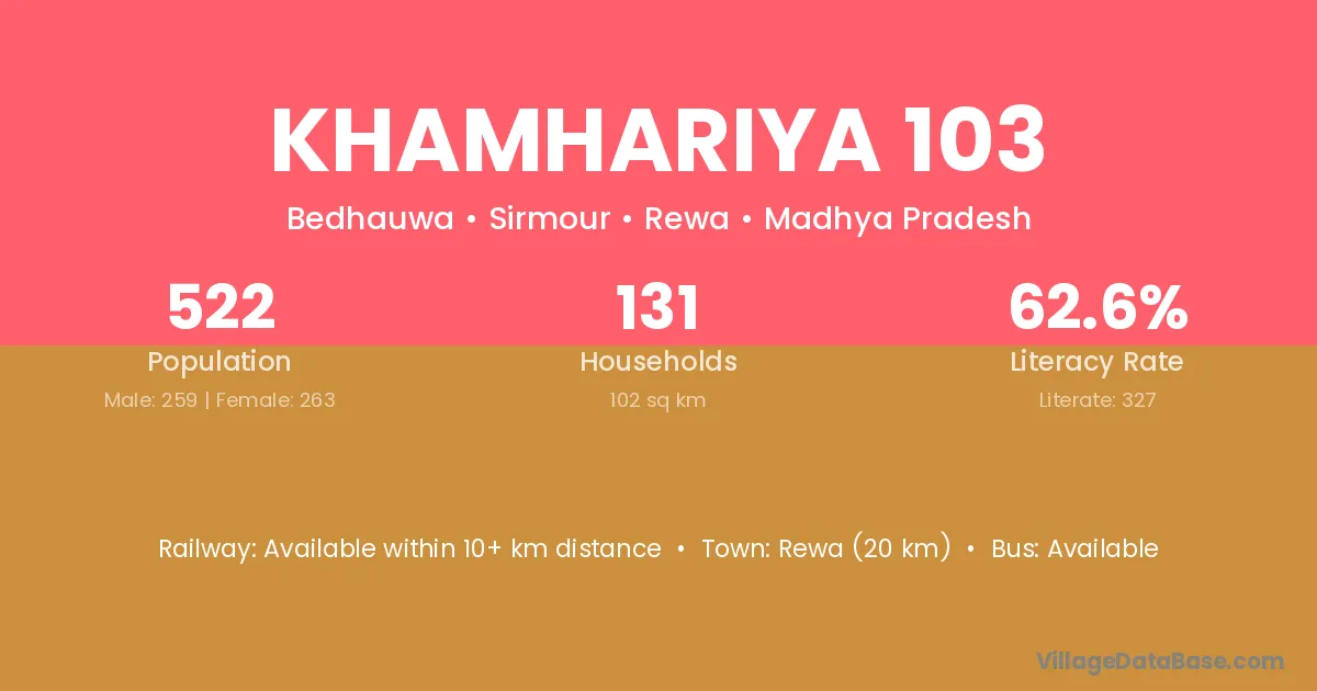 Rewa (20 km) is the nearest town to Khamhariya 103 village for major economic activities and is located approximately 20 km away.