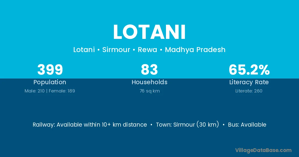 Lotani village has a total population of 399 people, of which 210 are males and 189 are females.