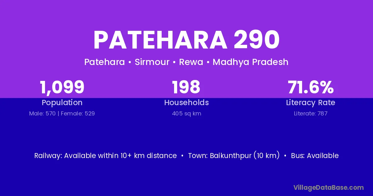 Baikunthpur (10 km) is the nearest town to Patehara 290 village for major economic activities and is located approximately 10 km away.