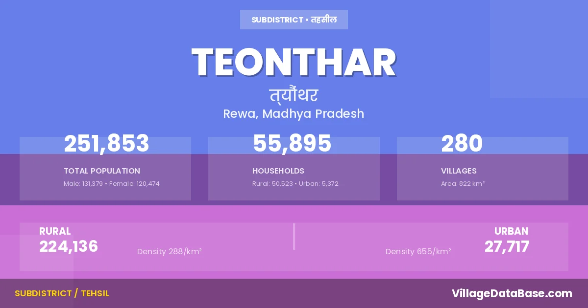 According to the 2011 census The total area of Teonthar Tehsil is 822 km², with a population of 251853 people. The population density is 306 inhabitants per square kilometre, and there are approximately 55895 houses in the sub district.