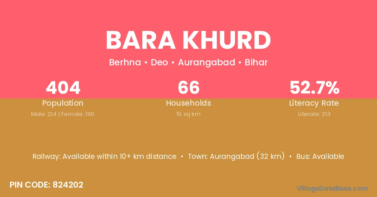 Bara Khurd village has a total population of 957 people, of which 475 are males and 482 are females.