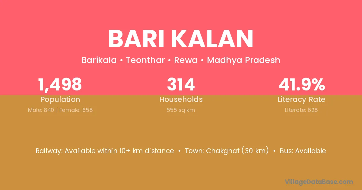 Chakghat (30 km) is the nearest town to Bari Kalan village for major economic activities and is located approximately 30 km away.