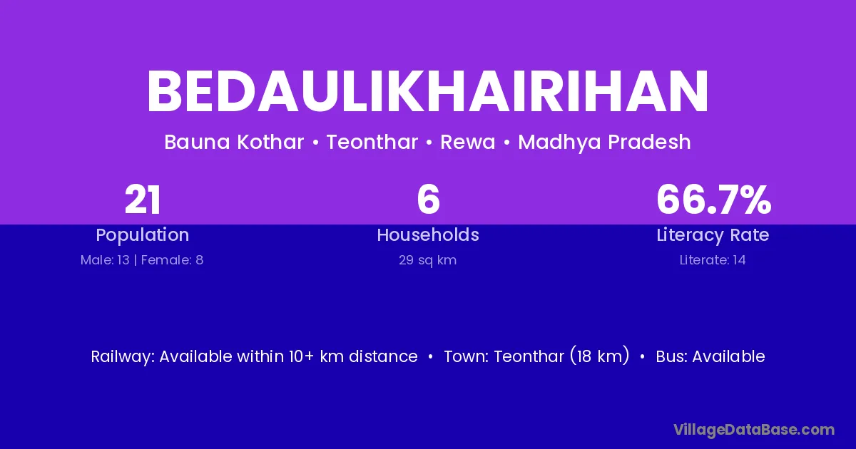 Teonthar (18 km) is the nearest town to Bedaulikhairihan village for major economic activities and is located approximately 18 km away.