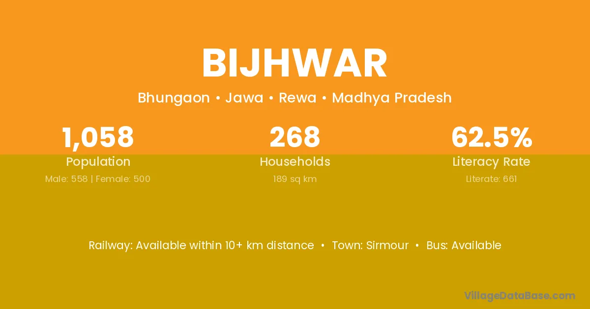 Bijhwar village has a total population of 371 people, of which 191 are males and 180 are females.
