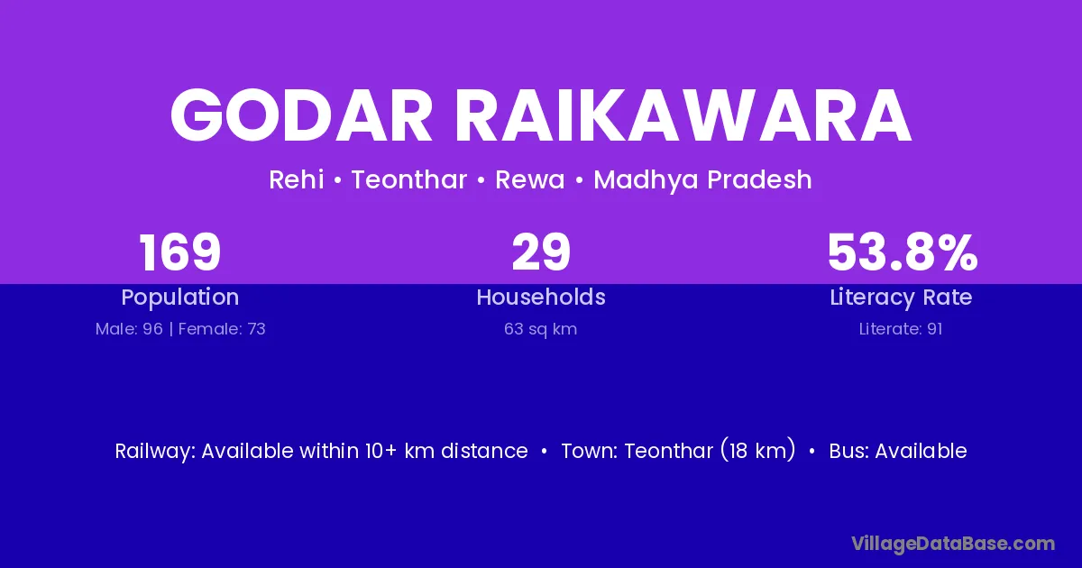 Teonthar (18 km) is the nearest town to Godar Raikawara village for major economic activities and is located approximately 18 km away.