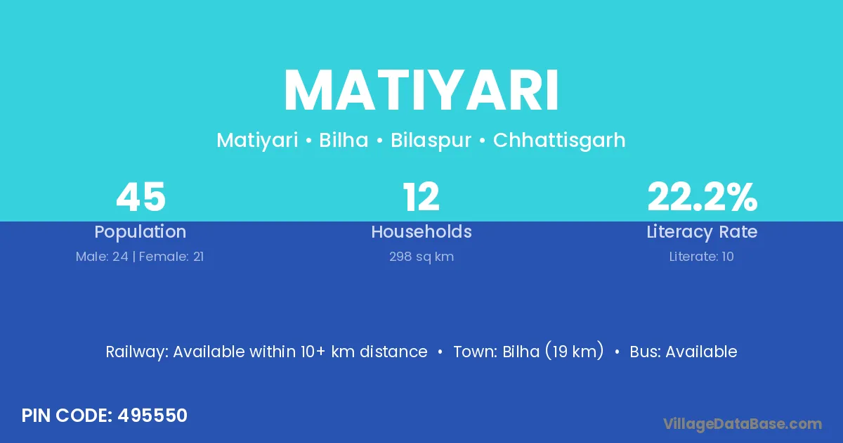 The literacy rate of Matiyari village is 50.65%. Male literacy stands at 58.42% and female literacy at 41.60%.