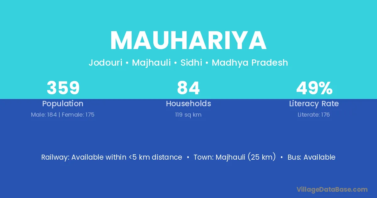 Teonthar (50 km) is the nearest town to Mauhariya village for major economic activities and is located approximately 50 km away.