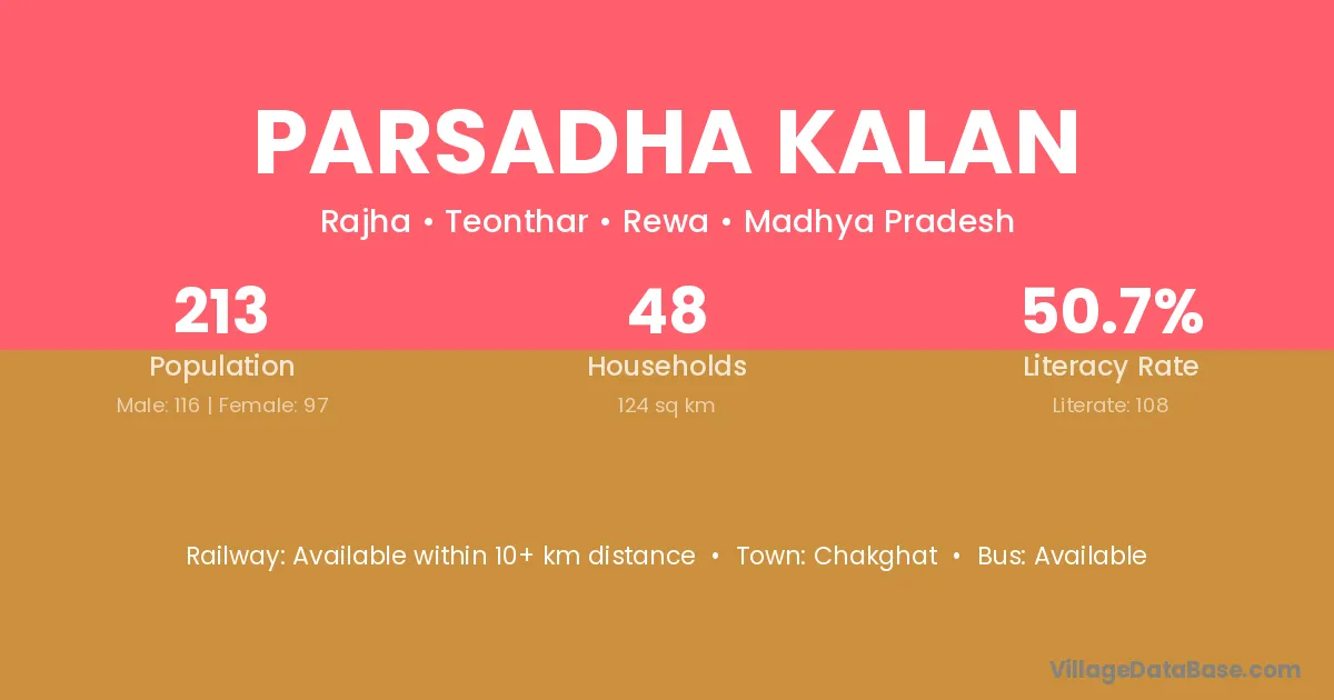 Parsadha Kalan village has a total population of 213 people, of which 116 are males and 97 are females.