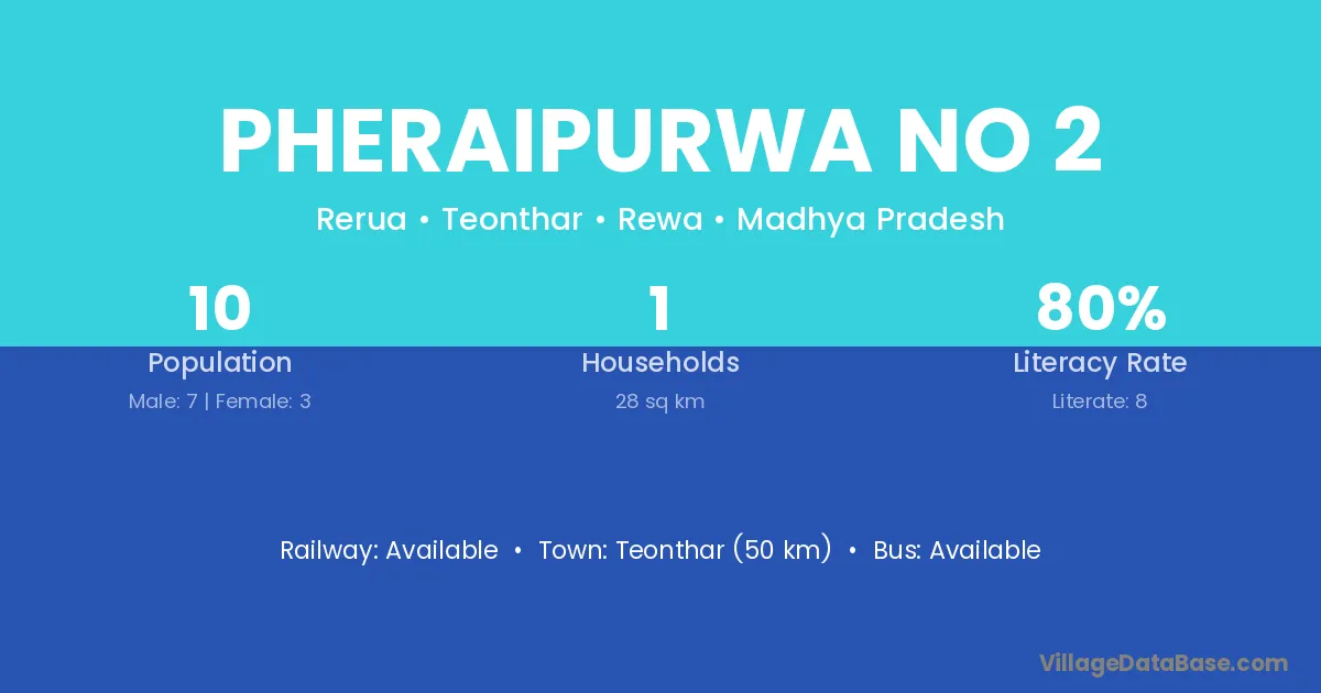 Teonthar (50 km) is the nearest town to Pheraipurwa No 2 village for major economic activities and is located approximately 50 km away.