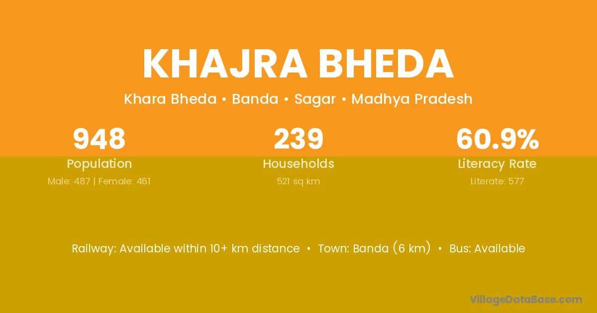 Khajra Bheda village has a total population of 948 people, of which 487 are males and 461 are females.