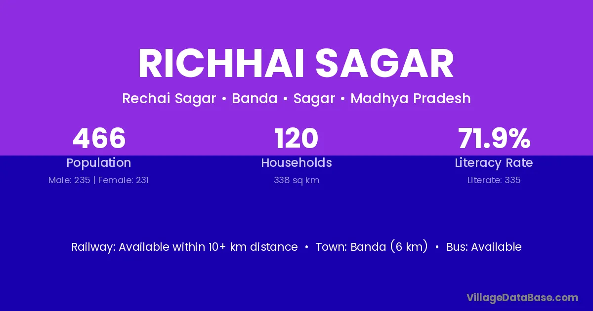 Banda (6 km) is the nearest town to Richhai Sagar village for major economic activities and is located approximately 6 km away.