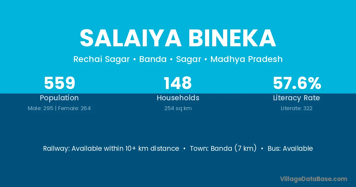 Banda (7 km) is the nearest town to Salaiya Bineka village for major economic activities and is located approximately 7 km away.