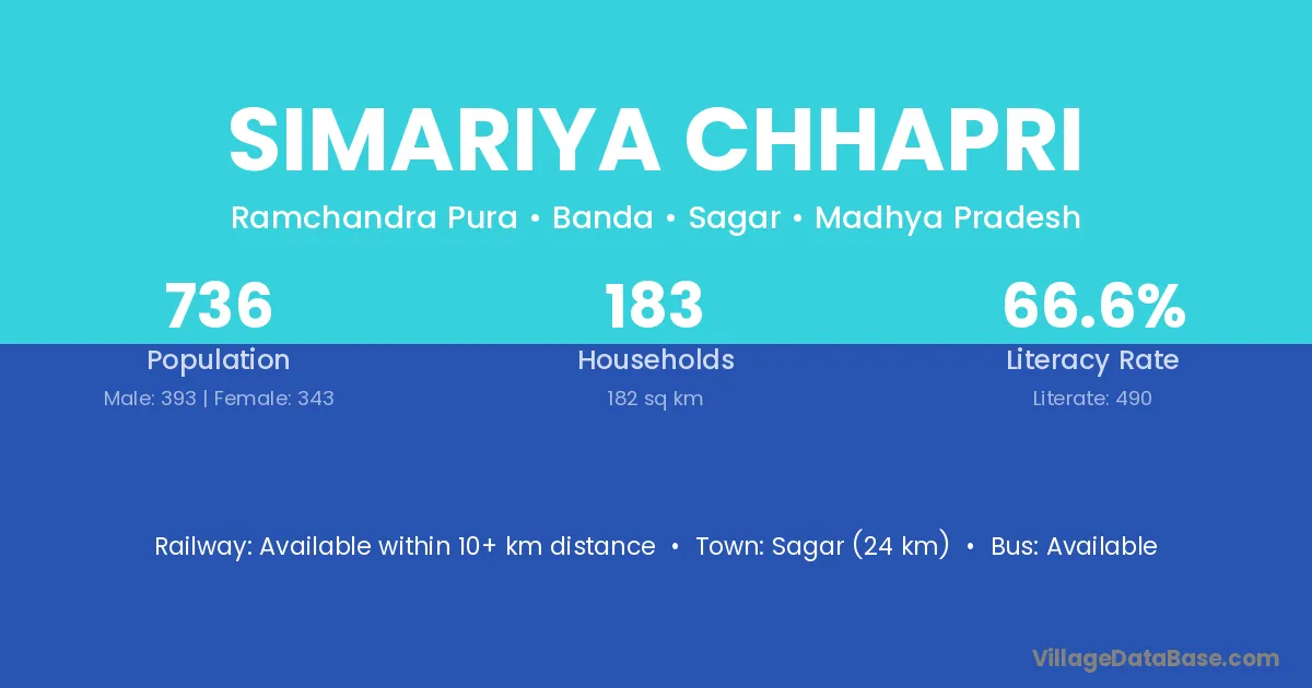 Sagar (24 km) is the nearest town to Simariya Chhapri village for major economic activities and is located approximately 24 km away.